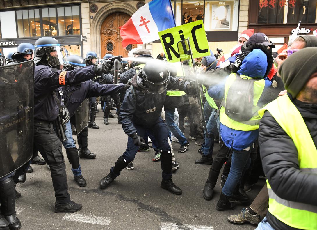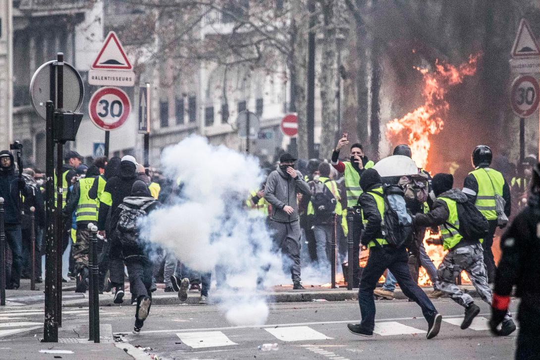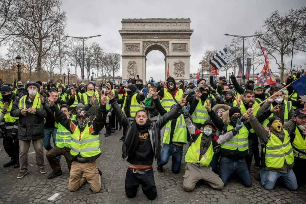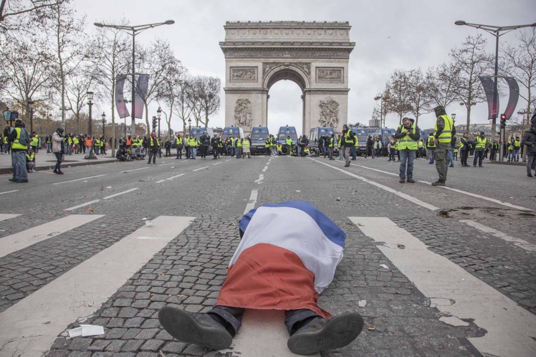 Den 17. november 2018 gik Frankrig i chok. Demonstranter i hundredtusindvis strømmede spontant ud på gaderne og besatte 3.000 rundkørsler og mange af betalingsanlæggene ved motorvejene. Derefter fulgte enorme demonstrationer i de store byer – ikke mindst i Paris på Champs Élysées. Alle bar de gule veste.